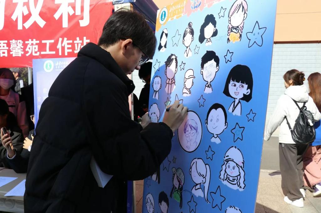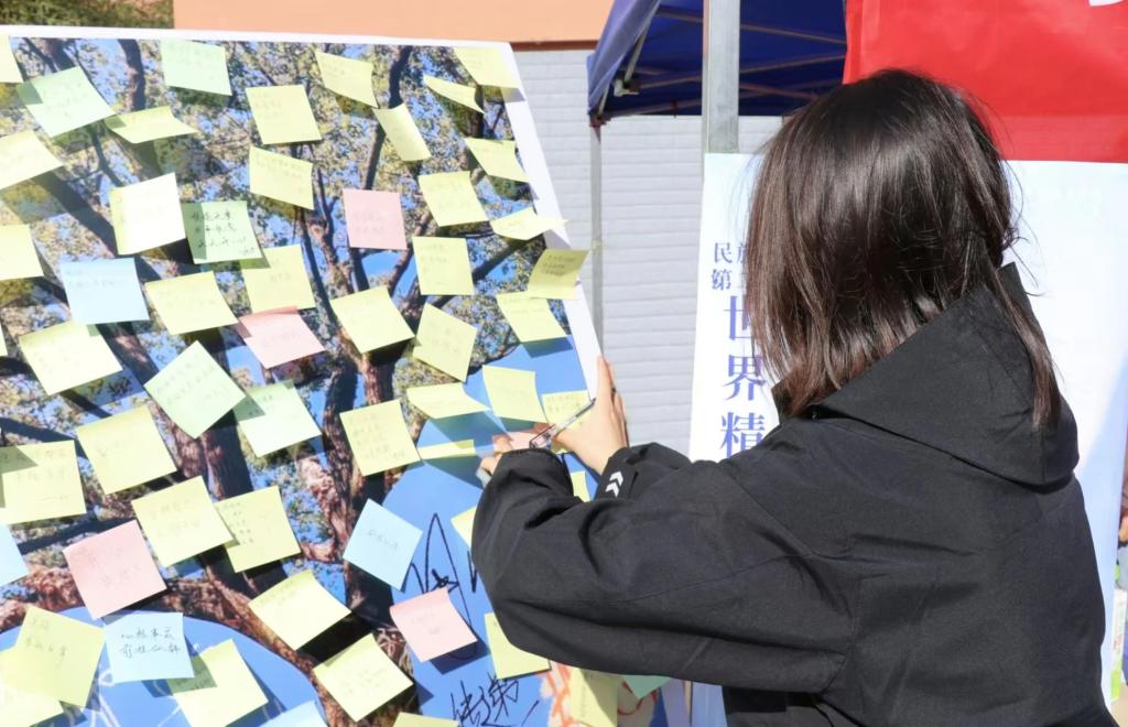 在互动环节,主要以书写并粘贴“心理便利贴”以及“画出自己心中的笑脸”作为活动形式。鼓励同学们在便利贴上写下对自己、家人和朋友的“心语心愿”,其内容涵盖祝愿、激励、烦恼或者困扰等方面,同时描绘出自己内心所喜爱的形象。借助这些方式,促使同学们在书写与绘画的进程中学会自我调适,培养积极的心态,勇敢地规划未来,摒弃杂念,抛开烦恼和焦虑等不良情绪,探寻与自我和谐共处的途径。活动现场氛围热烈非凡,往来的学生们都积极地书写内心感受,勾勒自我形象,描绘笑脸,并与“心灵树”合影留念。