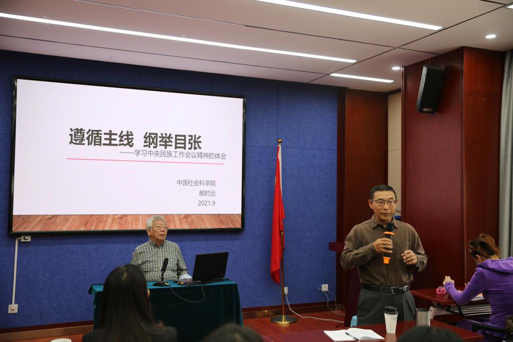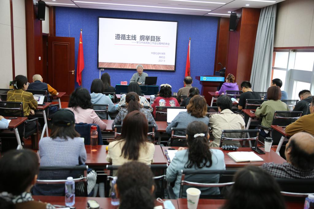 郝时远教授,围绕铸牢中华民族共同体意识,解读了习近平总书记在8月28日中央民族工作会议上重要讲话之“十二个必须”的核心要义,系统阐释了习近平总书记关于加强和改进民族工作的重要思想和“铸牢中华民族共同体意识为主线”推动新时代党的民族工作高质量发展的中央民族工作会议精神。