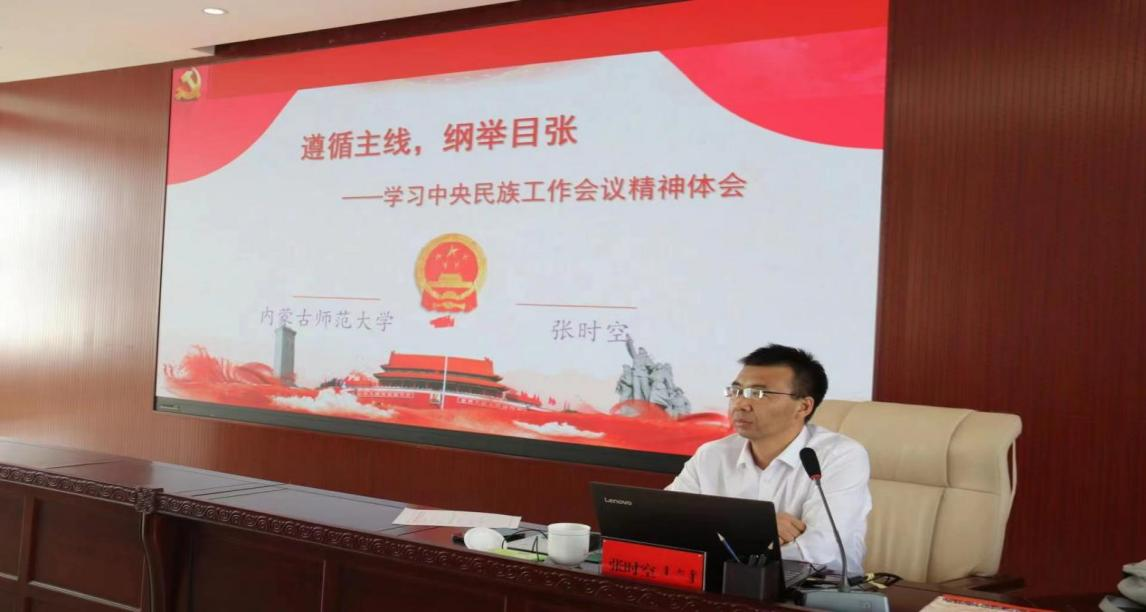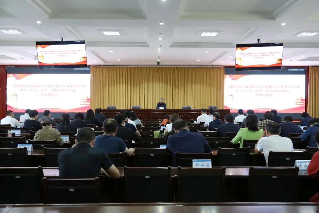 5月25日下午,学院举办党委理论学习中心组2022年第6次集体学习(扩大)会暨“民族政策宣传月”专题报告会,邀请澳门电子pg游戏官网张时空副教授作民族政策理论教育专题报告。学院党委书记冯呼和主持会议并讲话,学院党委班子成员,巴彦淖尔市民族事务委员会党组成员、副主任闫宇,巴彦淖尔市民族事务委员会办公室主任李杰、政策法规科科长哈斯巴根、民族团结促进中心干部王思琴,学院副处级以上干部,各院系团学科长,马克思主义学院全体教师参加报告会。