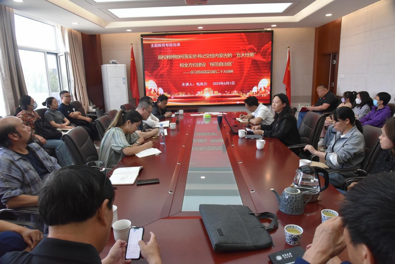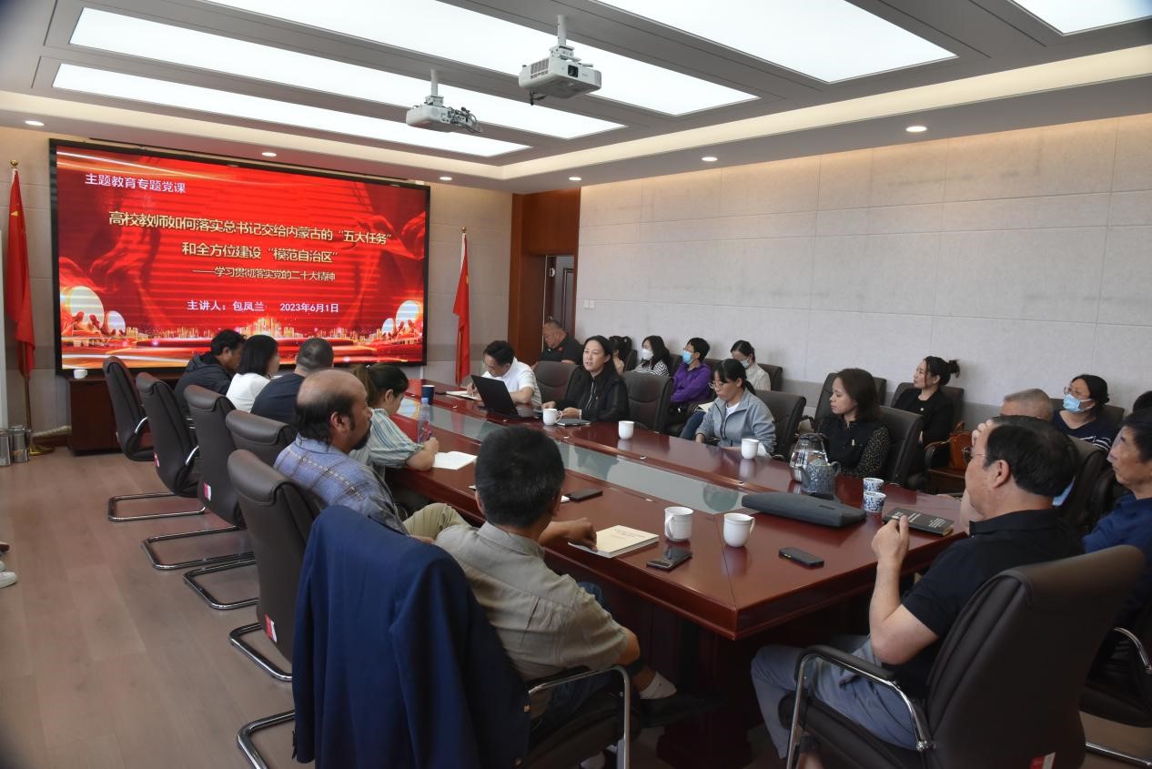 6月1日下午,澳门电子党委书记包凤兰在田楼607会议室为学院教工做“高校教师如何落实总书记交给内蒙古的‘五大任务’和全方位建设‘模范自治区’”的主题教育专题党课。会议由党委委员、副院长满达主持。