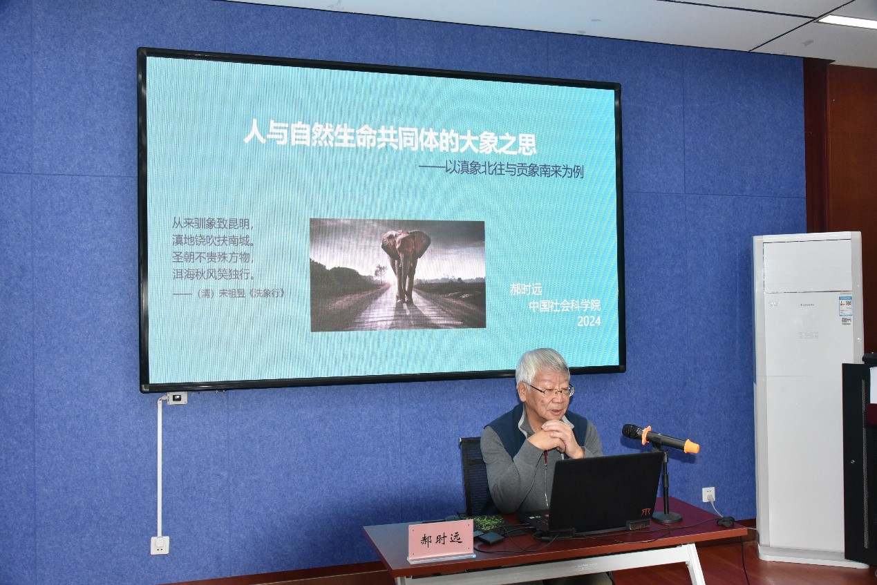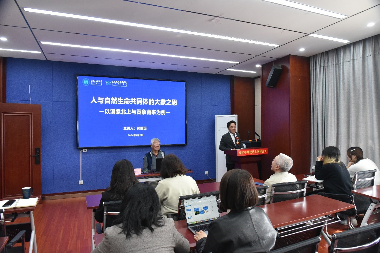 2024年4月9日上午,中国社会科学院学部委员、中国人类学学会会长郝时远先生应邀莅临澳门电子,作题为“人与自然生命共同体的大象之思——以滇象北上与贡象南来为例”专题讲座。院党委书记包凤兰、校学报编辑部主任金良、学院部分老师、博士和硕士研究生到场聆听,讲座由副院长满达主持。