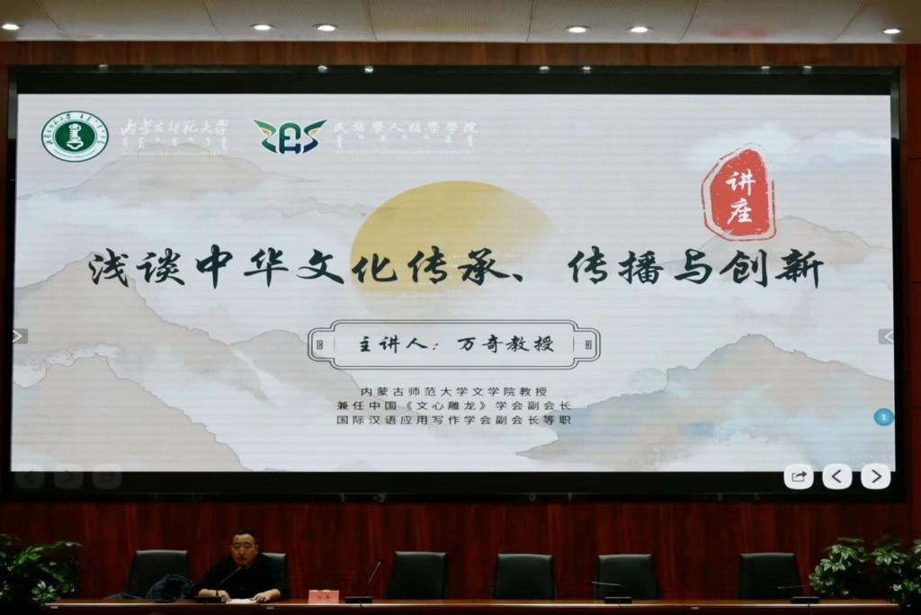 12月24日下午,澳门电子pg游戏官网文学院教授、中国《文心雕龙》学会副会长万奇先生,在赛罕校区信息报告厅进行题为“浅谈中华文化传承、传播与创新”的学术讲座。澳门电子团总支书记姜鑫、学生工作与就业办公室主任包双成出席本次讲座,师生代表两百余人聆听本次讲座。