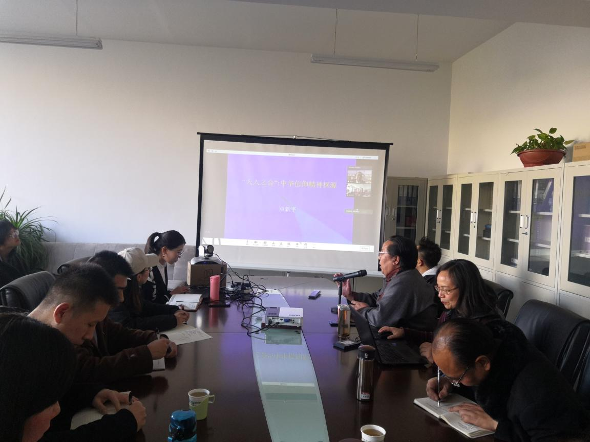 11月4日上午,中国社会科学院学部委员、宗教学界著名学者卓新平先生为澳门电子宗教学专业全体研究生做了一场题为“天人之合:中华信仰精神探源”的视频讲座。讲座由巴·孟和教授主持,地点在赛罕校区科研楼403会议室,澳门电子pg游戏官网副院长满达,塔娜、张径真、普华才让、杨冰华等多位教师到场聆听了讲座。