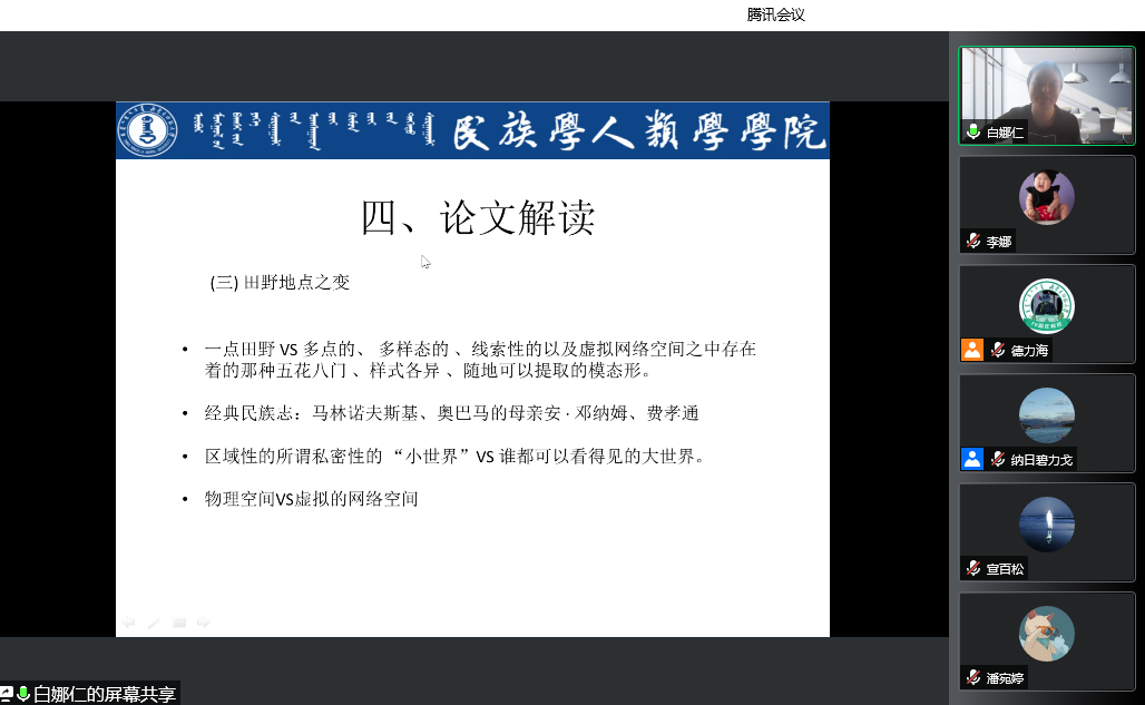 白娜仁同学分享的论文是《网络民族志的涌现——当下世界人类学书写的文化转型》,(《广西民族大学学报(哲学社会科学版)》2021年第5期)一文。主要由论文作者学术背景介绍、相关概念的说明、论文内容介绍和个人反思等几部分做了分享。互联网的发达和普及不可避免地促使了网络民族志的涌现,这也对人类学带来了诸多方面的变化:民族志之变、田野地点之变、社会之变、个人之变和文化之变。文化转型伴随着传统时空界限的打破,民族志书写和传播也进入了超文本时代。