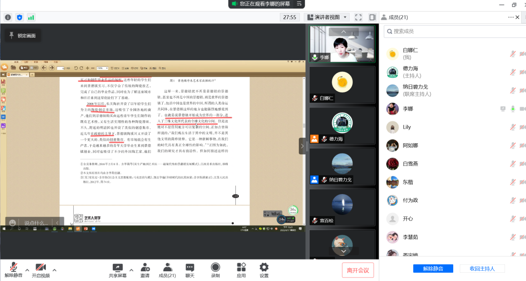李娜同学分享的论文是《超越现代性的景德镇发展模式:从生产地到艺术区的变迁》,(《民族艺术》2020年第5期)一文。分享者首先介绍了论文作者、发表期刊及文章研究视角等基本概况,其次重点介绍了该论文的主要内容,研究意义等,强调景德镇的发展模式就是一个中国发展的新模式,这个模式在全球化的基础上发掘了传统的技术资源、文化资源,做到了与世界的文化和经济共享共赢,美美与共。