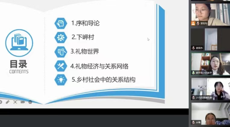 2022年4月28日晚澳门电子pg游戏官网2021级学硕一班在“腾讯会议”举行了第6期“碧立格”系列读书报告会。参加本次会议的五个专业有人类学、民俗学、宗教学、民族学、马克思主义民族理论与政策。本次读书会的汇报者是是来自2021级民族学专业的麻芳雪同学,汇报的书目是《礼物的流动》。民族学专业硕士研究生导师麦拉苏副教授出席本次读书报告会并进行了指导与评价。会议主持人是2021级民族学硕士研究生宣俭玲同学。会议主要分三大环节。分别是主讲人讲解《礼物的流动》这本书;全体参与发言与讨论;指导老师的点评。