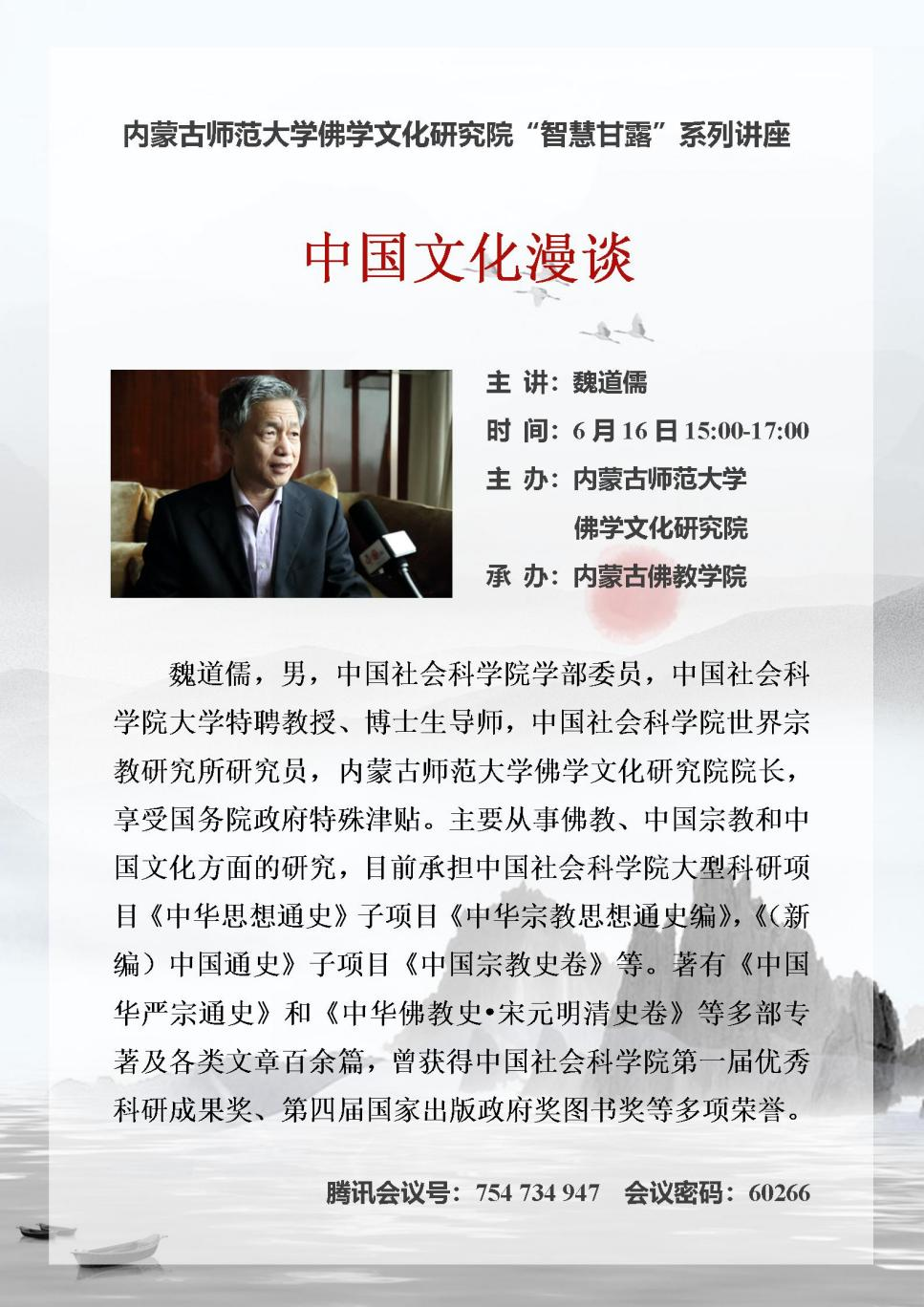 6月16日下午,中国社会科学院学部委员、我校佛学文化研究院院长魏道儒先生应邀做客“智慧甘露”系列讲坛,在线上为澳门电子师生做了题为“中国文化漫谈”学术讲座。讲座由副院长满达主持,宗教学专业全体师生及内蒙古佛教学院院长布仁满都拉等全体师生聆听了讲座。